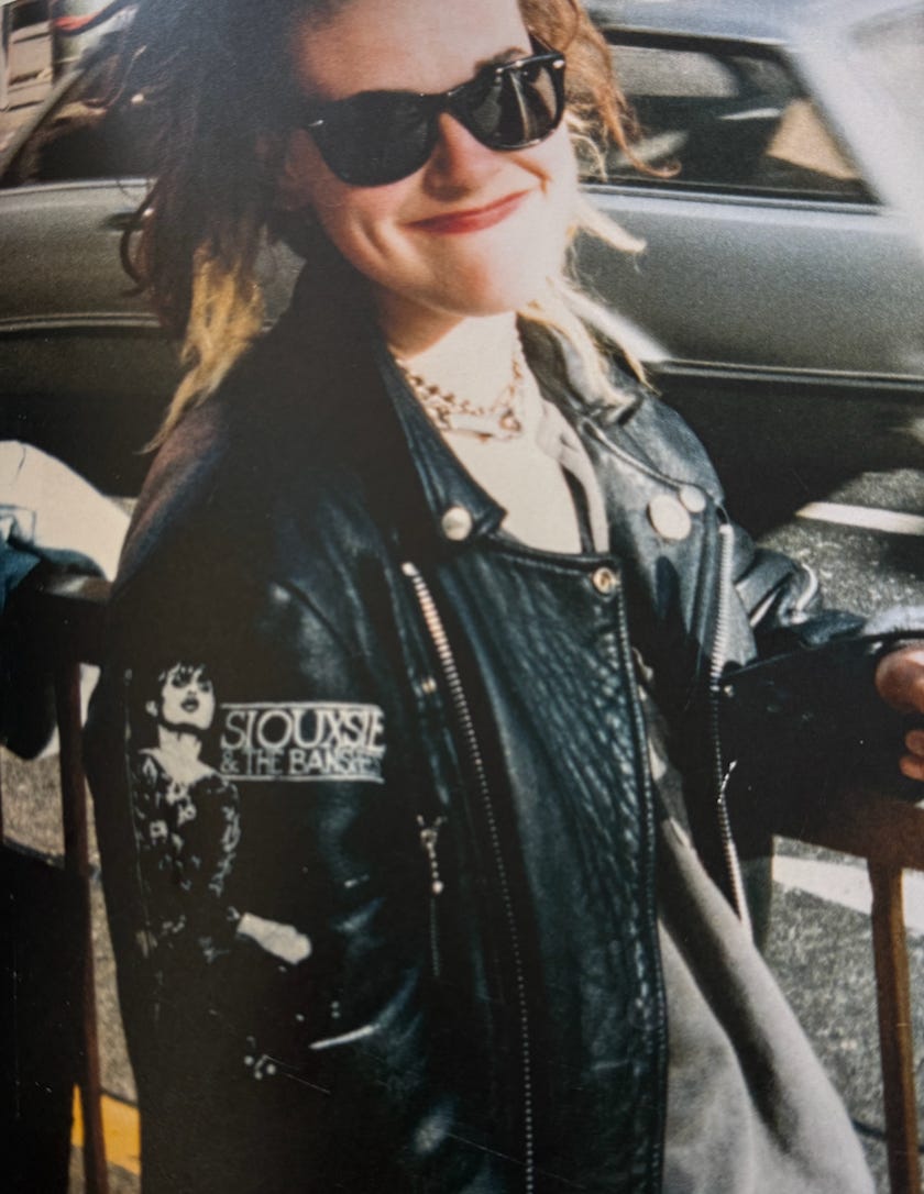 Looking at a photograph of young Sue Webster in a similarly bespoke leather jacket, I begin to imagine just what these jackets mean to her now. Siouxsie Sioux became “the surrogate mother I’d long been searching for”, Webster writes, standing in for the lack of attachment she felt to her own mother. To Webster, the jackets serve as both aspirations and markers of her journey toward the fully realized self; when in one, Webster’s in the arms of Siouxsie’s embrace. I think of how I feel wearing my PJ Harvey and, for that matter, “Teenage Banshee” T-shirts: Harvey and Webster (who are, incidentally, friends) are my surrogate mothers. Wearing those shirts, I’m pronouncing myself as not just in kinship with them, but also in pursuit of the self I want to become.